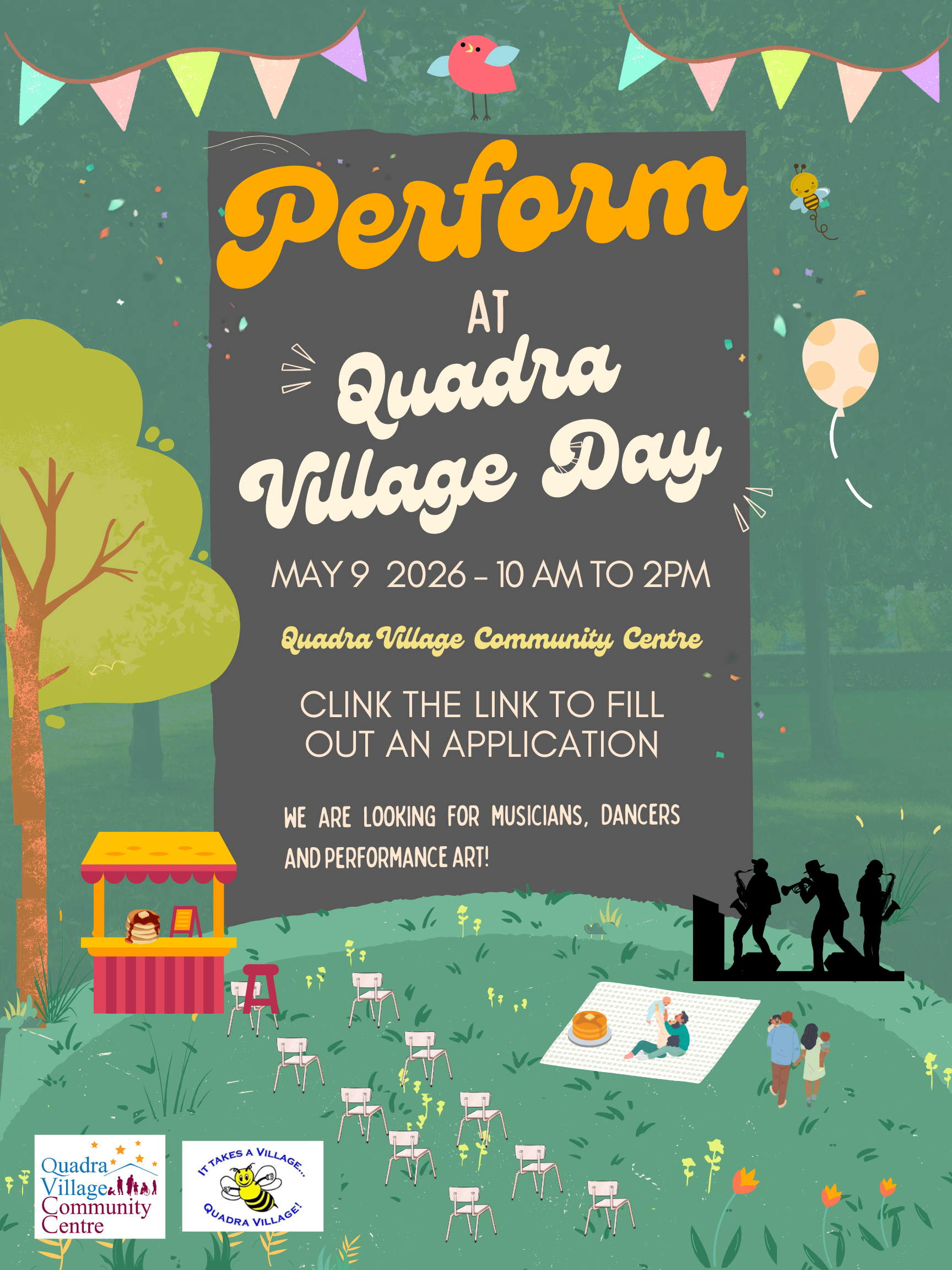 Whether you’re a solo act, part of a group, or something wonderfully unique, we’d love to hear from you. Quadra Village Day is all about showcasing local talent, creativity, and culture in a fun, welcoming atmosphere.